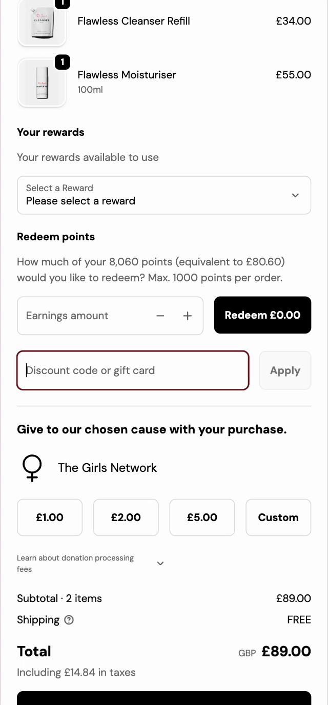 Head to checkout and click the 'Add discount' button. This will reveal the redeem points slider where you can select how many points you'd like to use (up to £10 against your order).